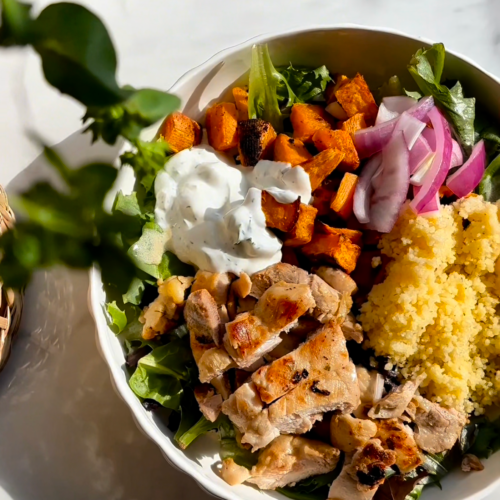 Start with a bed of spring mix. Drizzle lightly with vinaigrette. Add roasted sweet potatoes, a scoop of couscous, sliced chicken, a dollop of tzatziki, and pickled onions. Finish with extra vinaigrette or herbs on top.