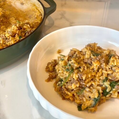 This creamy ground beef and rosso pesto orzo is an easy, one-pan dinner packed with bold flavor. Made with tender orzo, melty mozzarella, and spinach for a touch of freshness, it’s the perfect cozy meal for busy weeknights that still feels elevated.