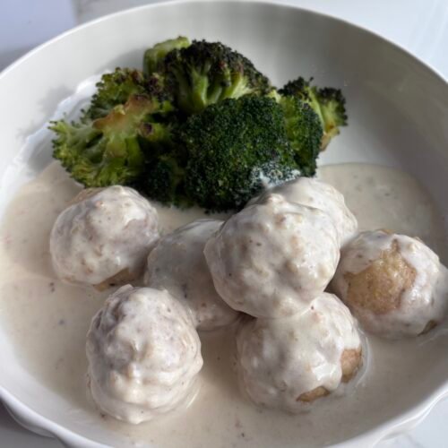 These chicken meatballs are sooo easy to make, and when my picky eater asked for three helpings, I knew this recipe was a keeper. They’re juicy, cheesy, and full of flavor — with or without the Parmesan cream sauce.